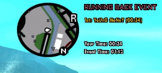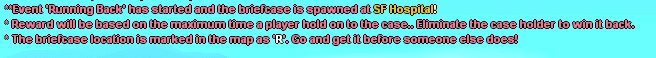 The Events and bank system need some explantion.1. Running Back EventAt random time the event will be started and it is all about holding the briefcase as long as you can and the time will be recorded and the winner will be based on that. The event will last 10 minutes, it doesn't need any command to participate. Whoever is online is a part of it. Once you pickup the briefcase you will be confined to using only a limited commands, the only way to escape is to vcall your own vehicle and flee the area, or just run for your life. There are currently no restrictions or stipulations set for the people in chase of the case holder.
